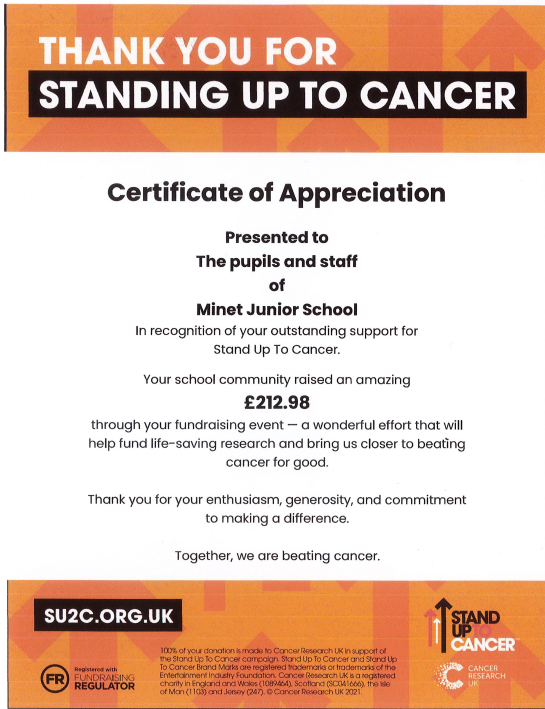 We raised money for Stand up to Cancer (su2c.org.uk). The staff and children wore their pyjamas to school and donated £1. We raised £212.98 in total. Thank you to all who contributed.