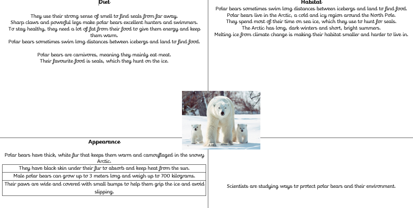 Students are exploring the impact of climate change through a non-chronological report on penguins and polar bears, which are considered a "global symbol" of the warming planet. This project combines science and geography with English skills, teaching children how to use formal language and technical vocabulary – such as carnivore, insulation, and blubber – to explain how these animals are uniquely adapted to the freezing Arctic environment. They have been practising the use of fronted adverbials, third-person perspective, and present tense to write like an expert. During their experience week, pupils conducted a hands-on experiment to understand a penguin's survival. By comparing the sensation of a bare hand in ice water to a hand insulated by cotton wool—simulating a penguin's blubber—children observed first hand how vital insulation protects these creatures in their freezing habitats. This practical investigation provided a foundation for their non-chronological reports, helping them describe the physical adaptations with greater scientific accuracy.